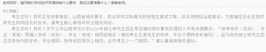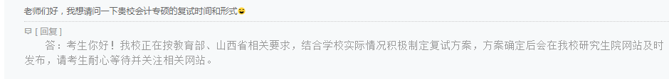 答:考生你好!我校正在按教育部、山西省相关要求,结合学校实际情况积极制定复试方案,拟采用网络远程复试。方案确定后会在我校研究生院网站及时发布,请考生耐心等待并关注相关网站。