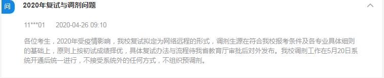 答:各位考生,2020年受疫情影响,我校复试拟定为网络远程的形式,调剂生源在符合我校报考条件及各