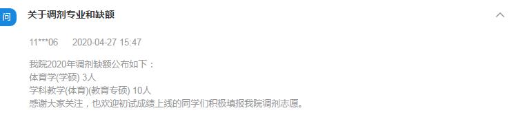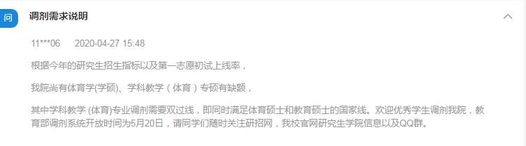 其中学科教学 (体育)专业调剂需要双过线,即同时满足体育硕士和教育硕士的国家线。欢迎优秀学生调剂我院,教育部调剂系统开放时间为5月20日,请同学们随时关注研招网,我校官网研究生学院信息以及QQ群。