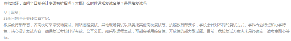 问:老师您好,请问全日制会计专硕有扩招吗?大概什么时候通知复试名单?是网络复试吗