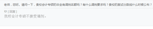 问:老师,您好。请问一下,贵校会计专硕的非全有调剂名额吗?有什么调剂要求吗?贵校的复试分数线什么时候公布?