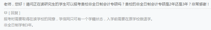 问:老师,您好!请问正在读研究生的学生可以报考贵校非全日制会计专硕吗?贵校的非全日制会计专硕是2年还是3年?非常感谢!