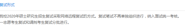 我校2020年硕士研究生招生复试采取网络远程复试的方式。复试笔试不再单独组织进行,纳入面试统一考核。