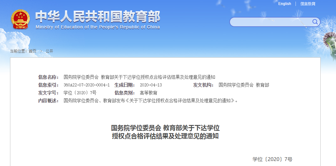 原标题:国务院学位委员会教育部关于下达学位授权点合格评估结果及处理意见的通知