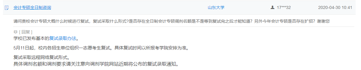 问:请问贵校会计专硕大概什么时候进行复试,复试采取什么形式?是否存在全日制会计专硕调剂名额是不是等到复试完之后才能知道?另外今年会计专硕是否存在扩招?谢谢您