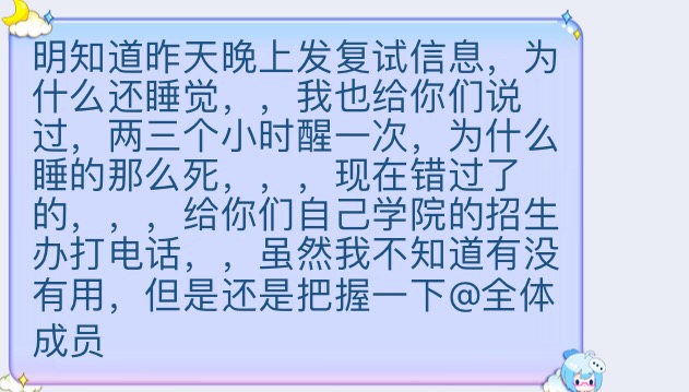 看完了他们的拟录取通知,心里是不是又重燃斗志,在这里小编想提醒大家️:院校随时都可能发复试通知,上面提到有同学真的在凌晨三点进行院校的复试❗️所以一定一定要保持手机通畅,随时查看调剂系统里是否有复试通知的提醒⏰隔一会就看一看研招网,辛苦就辛苦这么几天,别因为消息延迟耽误了正事!