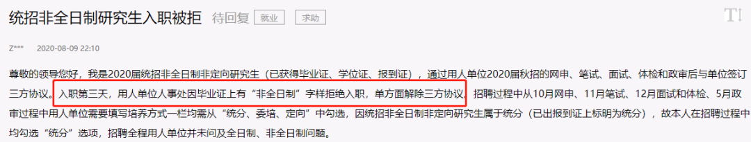 在“非全日制值不值得读”的讨论中,还有一个很重要的方向是,非全日制就业造歧视,很多网友表示很多用人单位人才引进政策中,均要求全日制硕士研究生,或者不将非全日制硕士毕业生视为应届毕业生,提出只有签署自愿放弃社保的协议才允许入职,还有部分地区事业单位转编要求必须为全日制硕士。