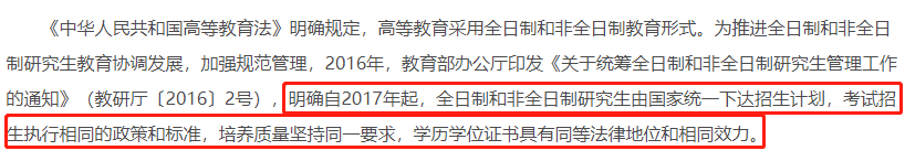 《通知》明确说明,自2017年起,全日制和非全日制研究生由国家统一下达招生计划,考生招生执行相同的政策和标准,培养质量坚持统一要求,学历学位证书具有同等法律地位和效力。