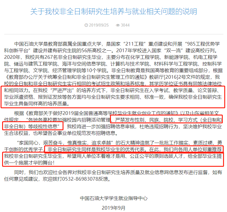针对非全日制研究生就业的不公平现象,多所高校在组织校园招聘会过程中为非全日制研究生发声。