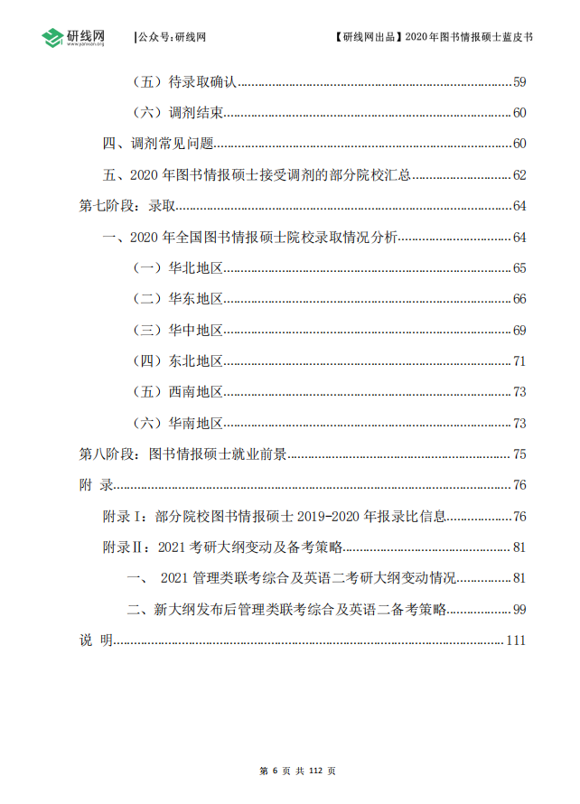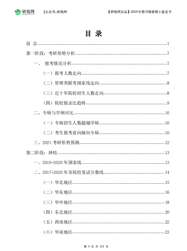 小编们历时几十天的搜集、汇总、整理、分析和筛查,终于不负众望,将这本近3万余字,112页的《2020年图书情报蓝皮书》制作完成。全书系统详细地展示了图书情报硕士各招生院校的历年分数线、招生情况、学制学费、录取情况(包含录取最高、最低、平均分及录取人数)、调剂缺额等数据。另外,还包含了拼搏在线官网初试大纲、网报流程、调剂指导等考生关心的内容。