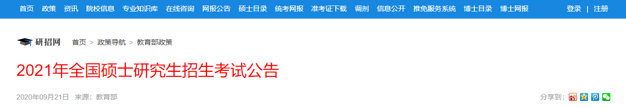 近日,根据《2021年全国硕士研究生招生工作管理规定》,教育部发布2021年全国硕士研究生招生考试有关事项公告,以下是“研招网发布:2021年全国硕士研究生招生考试公告”的原文内容。