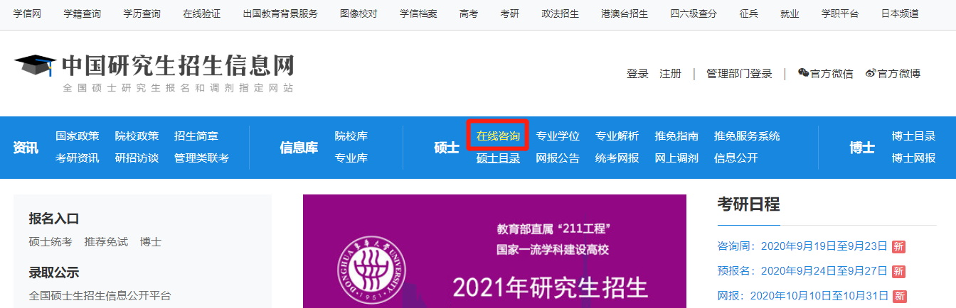 1、登录研招网(https://yz.chsi.com.cn/),选择“在线咨询”栏目。