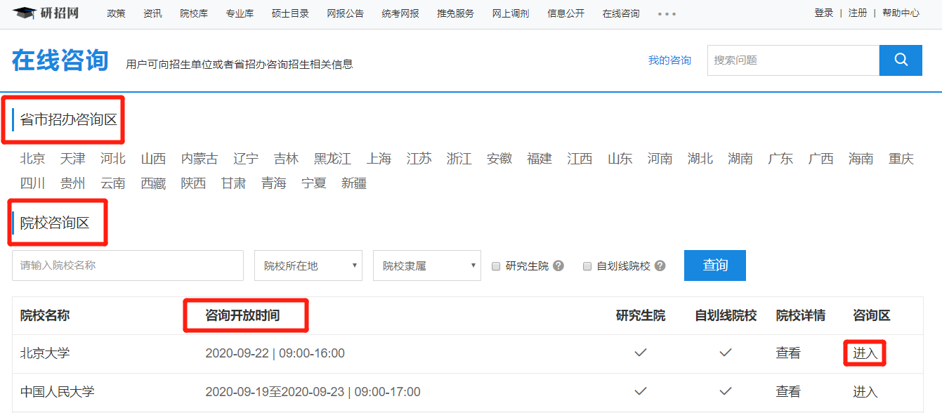 2、根据需求选择“各省市招办”或“院校”进行网上咨询。