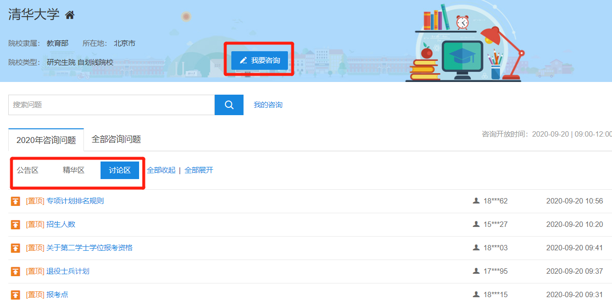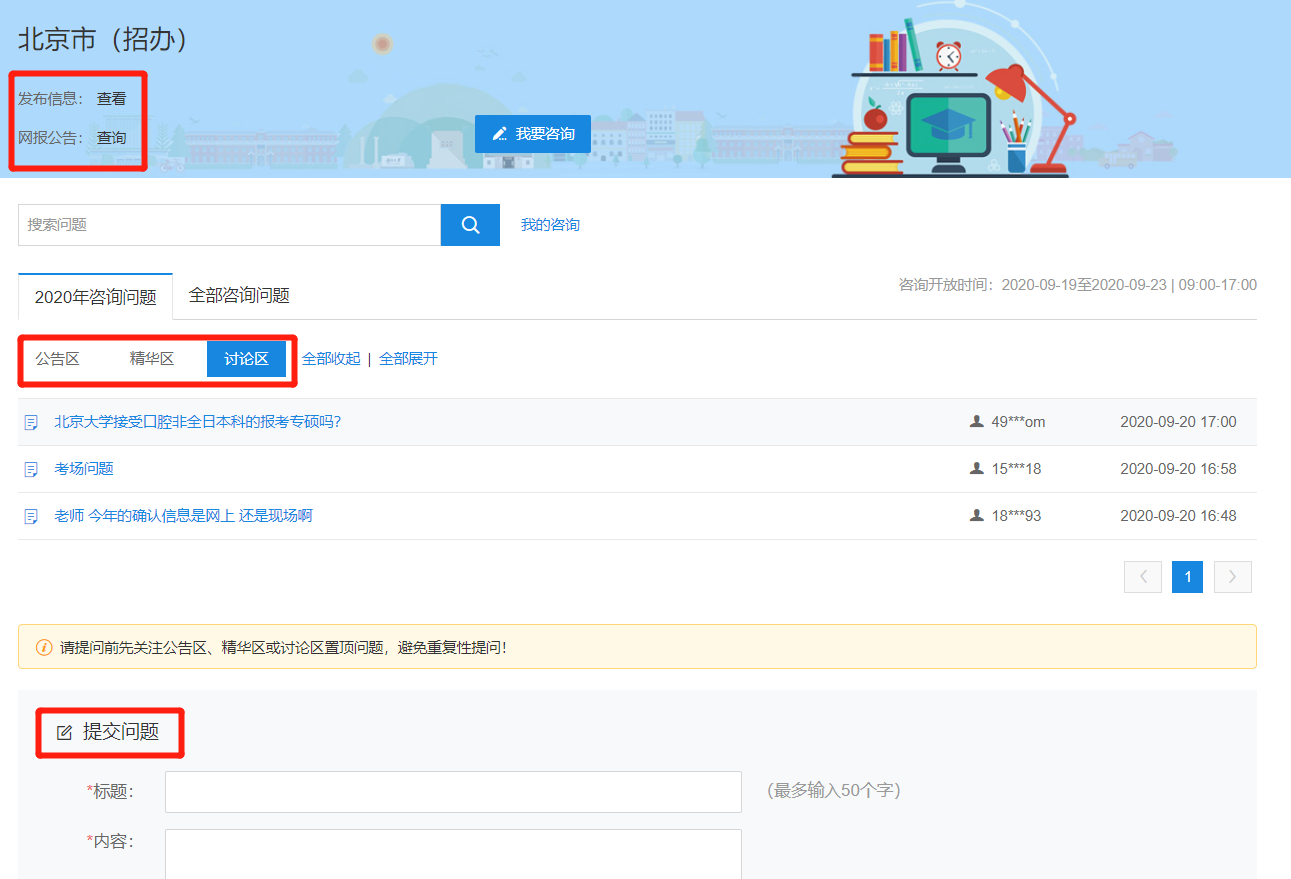 3、咨询前,可查看各省市招办及院校公告、已咨询问题等,避免重复性提问。