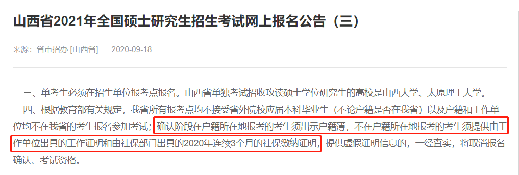 根据教育部有关规定,我省所有报考点均不接受省外院校应届本科毕业生(不论户籍是否在我省)以及户籍和工作单位均不在我省的考生报名参加考试;确认阶段在户籍所在地报考的考生须出示户籍薄,不在户籍所在地报考的考生须提供由工作单位出具的工作证明和由社保部门出具的2020年连续3个月的社保缴纳证明,提供虚假证明信息的,一经查实,将取消报名确认、考试资格。(微信公众号:研线网)