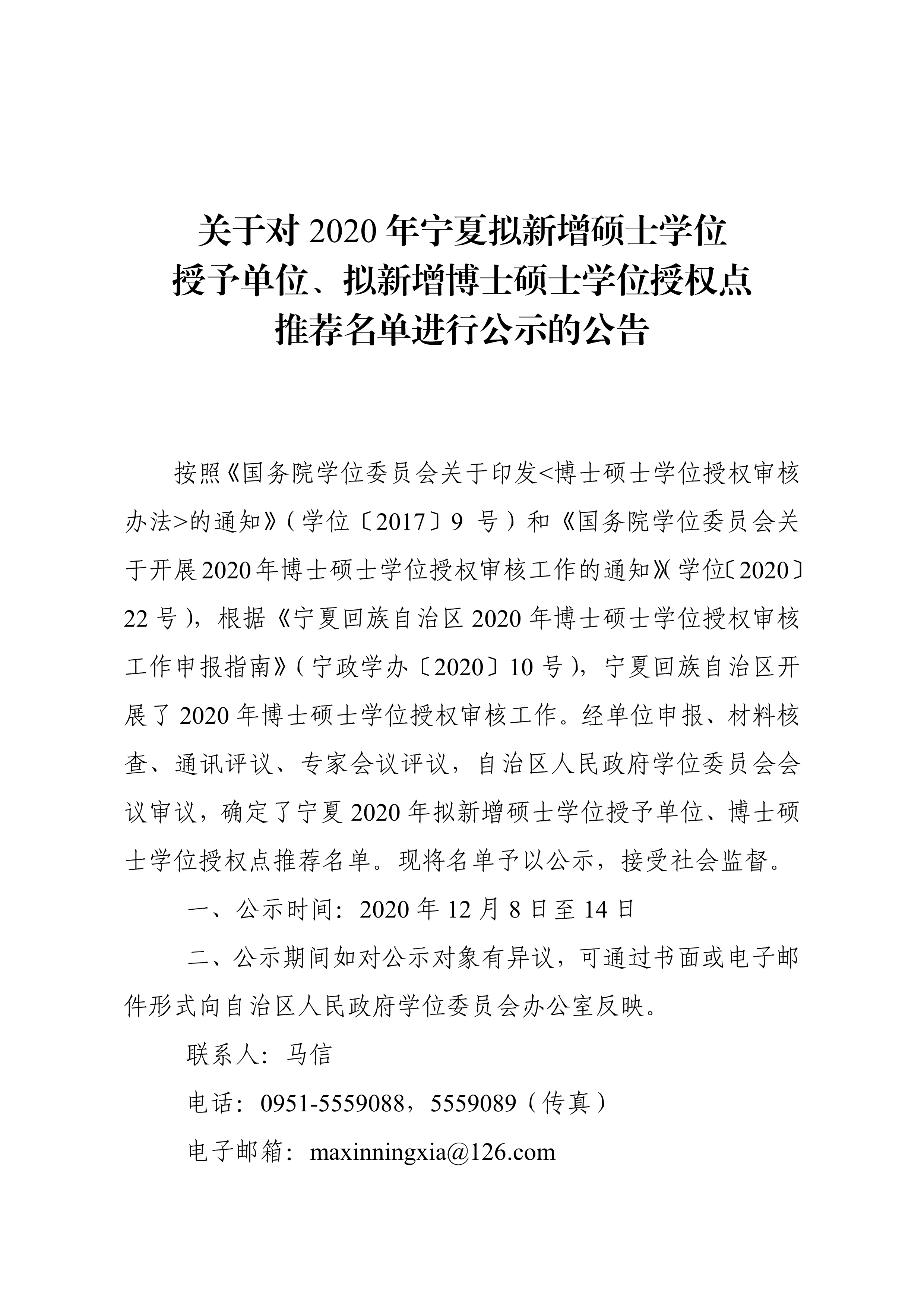 原文标题:关于对2020年宁夏拟新增硕士学位授予单位、拟新增博士硕士学位授权点推荐名单进行公示的公告