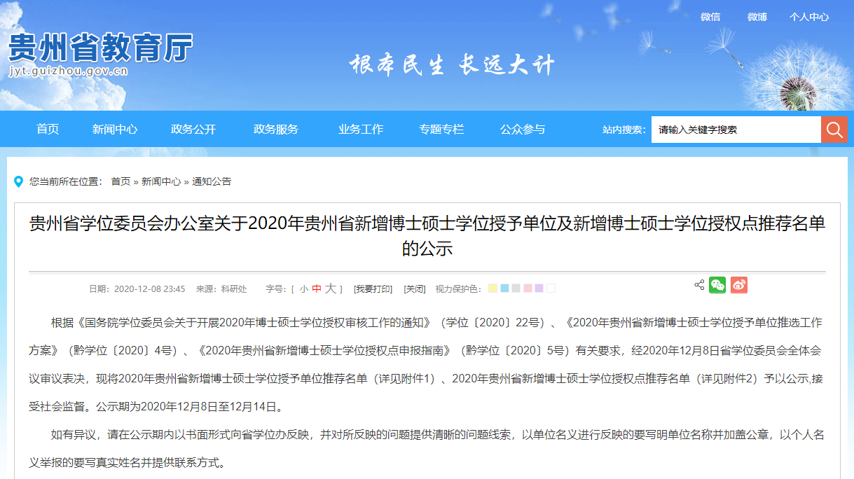 贵州省学位委员会办公室关于2020年贵州省新增博士硕士学位授予单位及新增博士硕士学位授权点推荐名单的公示