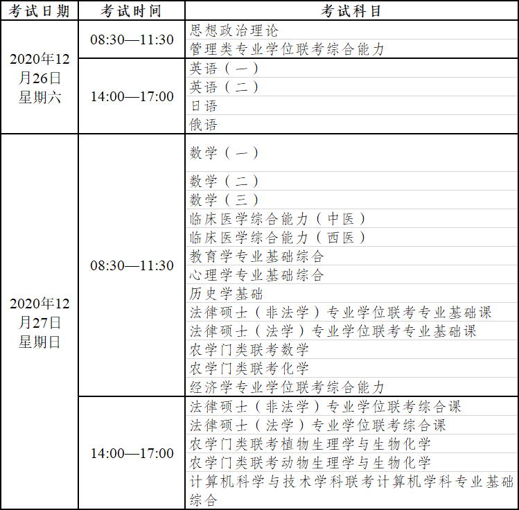 六、2021年全国硕士研究生招生考试初试全国统一命题科目考试时间: