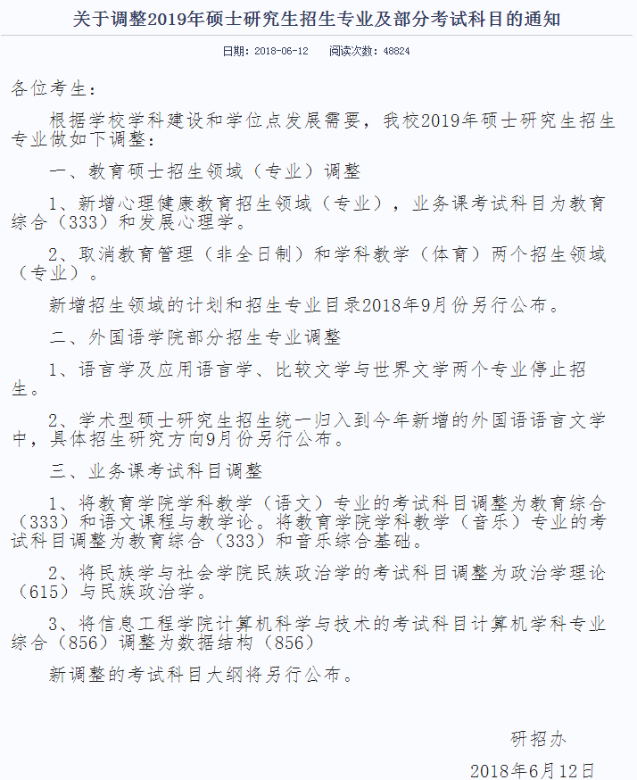 招生专业及部分考试科目调整