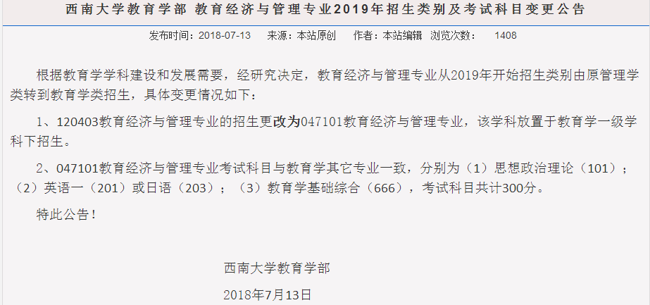 西南拼搏(中国)的教育经济与管理专业从2019年开始,招生类别由原管理学类转到教育学类招生,具体变化如下: