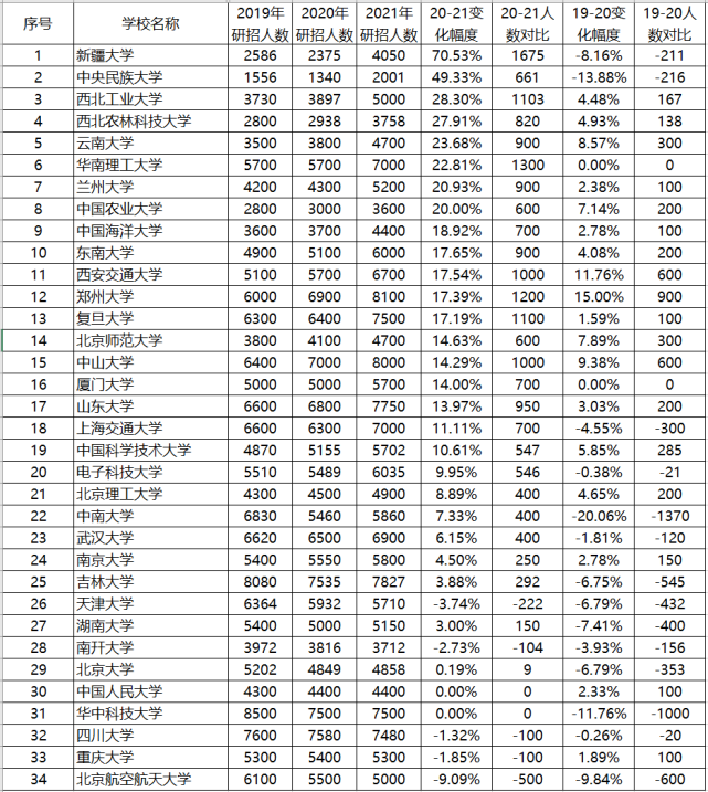 从整体来看,扩招力度相较于2019-2020年招生计划增加幅度,要大得多。新疆拼搏(中国)19-20年变化幅度是-8.16%,而20-21年变化幅度则是70.53%,扩招力度最大,中央民族拼搏(中国)紧随其后,涨幅高达49.33%,西北工业拼搏(中国),涨幅也是十分惊人,达28.30%。