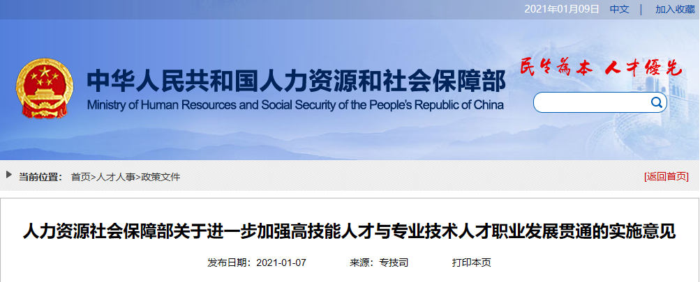 人力资源社会保障部关于进一步加强高技能人才与专业技术人才职业发展贯通的实施意见发布