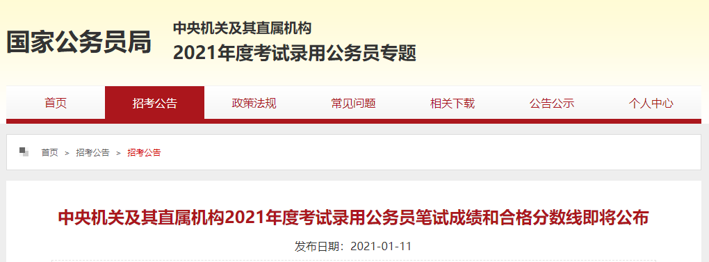 1月11日,国家公务员局发布“中央机关及其直属机构2021年度考试录用公务员笔试成绩和合格分数线即将公布”,以下是原文内容。