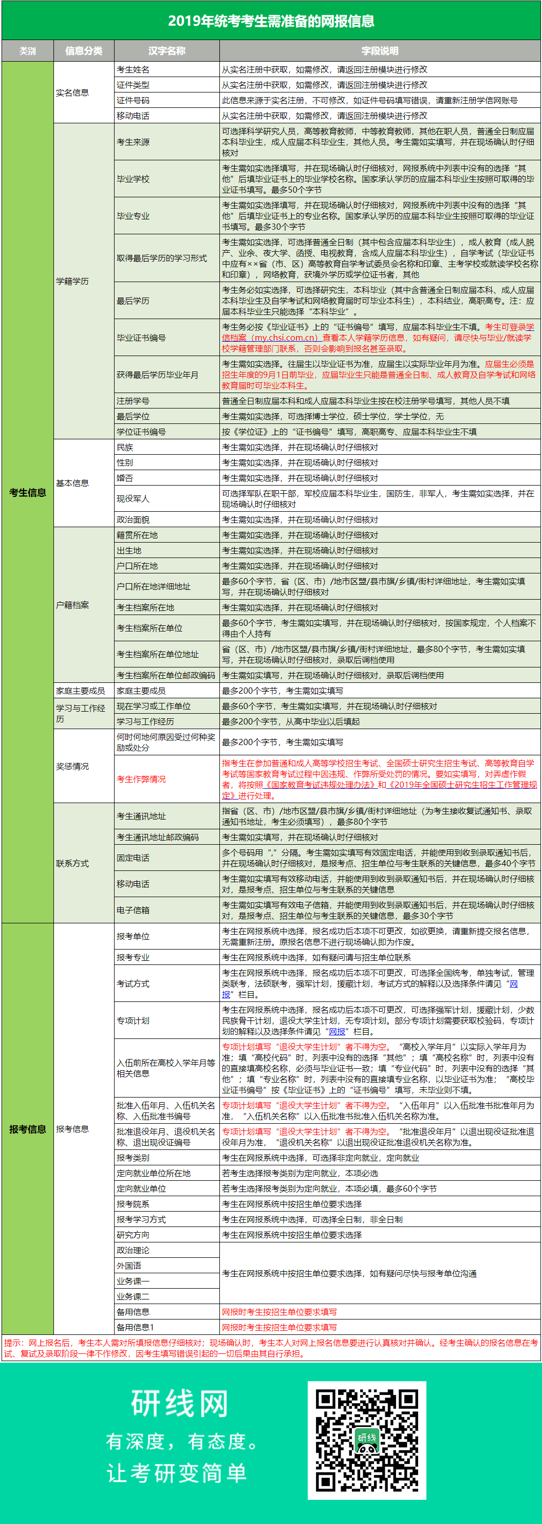 在这个阶段,考生可以参照本文附件2:2019年统考考生需准备的网报信息,把个人信息准备在一个word或excel表格里,按照系统提示填写考生信息。