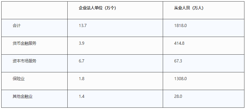 国家统计局第四次全国经济普查公报结果显示,2018年末,全国共有金融业企业法人单位13.7万个,从业人员1818.0万人(详见表1),比2013年第三次普查时,金融业企业法人单位增加10.8万个,从业人员增加1304.1万人。