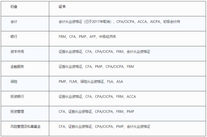 与此同时,国际认证资格证书近年来在国内逐渐兴起,并越来越被金融机构所认可。虽然各行业因其职能业务内容的不同,所认可的资格证书也有差异,如表5所示,但事实证明,国际认证资格证书因其专业权威性,已在求职领域中占有越来越重要的分量。