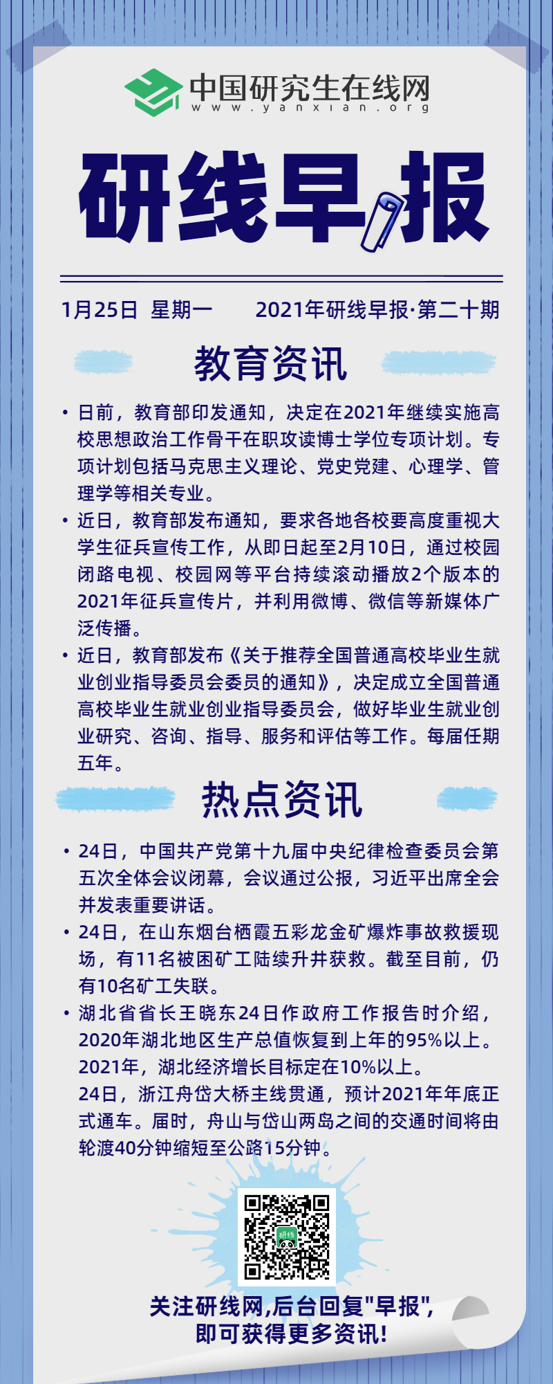 近日,教育部发布《关于推荐全国普通高校毕业生就业创业指导委员会委员的通知》,决定成立全国普通高校毕业生就业创业指导委员会,做好毕业生就业创业研究、咨询、指导、服务和评估等工作。每届任期五年。日前,教育部印发通知,决定在2021年继续实施高校思想政治工作骨干在职攻读博士学位专项计划。专项计划包括马克思主义理论、党史党建、心理学、管理学等相关专业。快来看看今天国内和教育行业还发生哪些事儿每天上午,研线网为你推送新鲜的新闻资讯,带你了解新闻资讯。