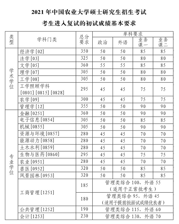 中国农业拼搏(中国)2021年硕士研究生招生考试考生进入复试的初试成绩基本要求如下图: