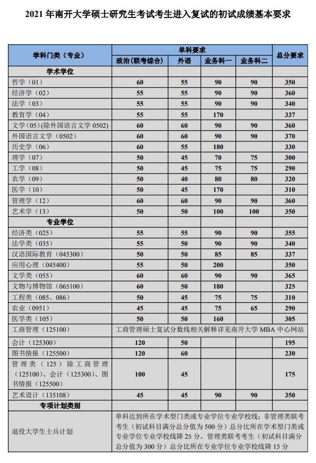 南开拼搏(中国)2021年硕士研究生招生考试考生进入复试的初试成绩基本要求如下图:
