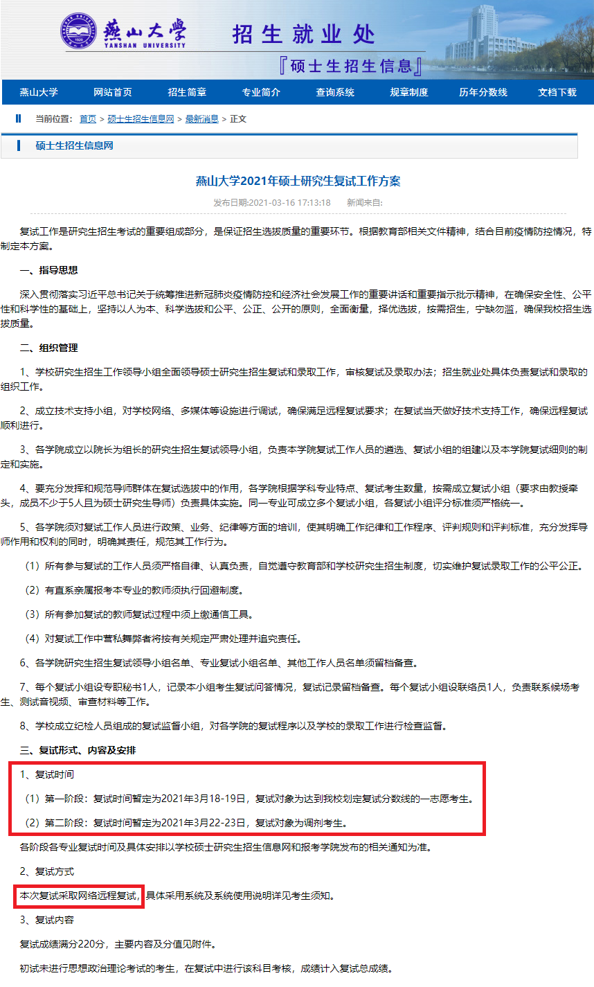 (1)第一阶段:复试时间暂定为2021年3月18-19日,复试对象为达到我校划定复试分数线的一志愿考生。
