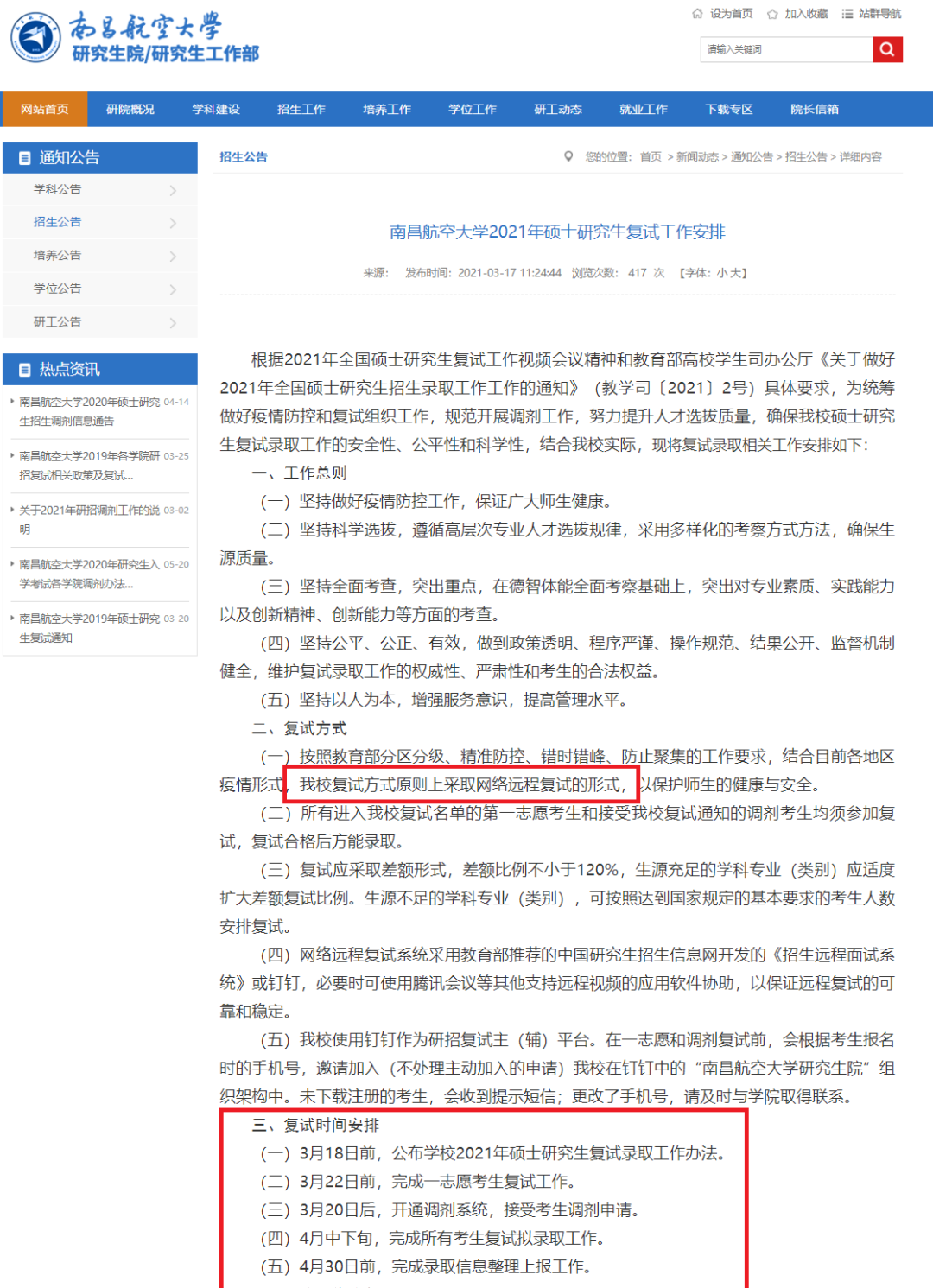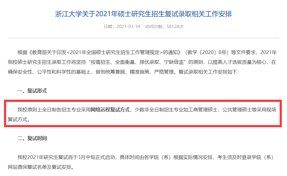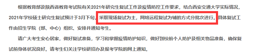 复试公告里面有复试时间、复试方式、复试内容以及复试条件要求,可解答同学们有关“什么时候参加复试?现场复试还是网络复试?都需要做哪些准备?”等复试疑问。今年有哪些院校究是网络复试呢?哪些院校是线下复试?