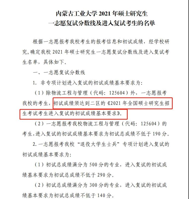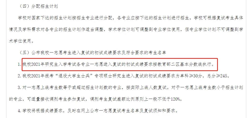 “我校2021年研究生入学考试各专业一志愿进入复试的初试成绩要求按教育部二区基本分数线执行。”