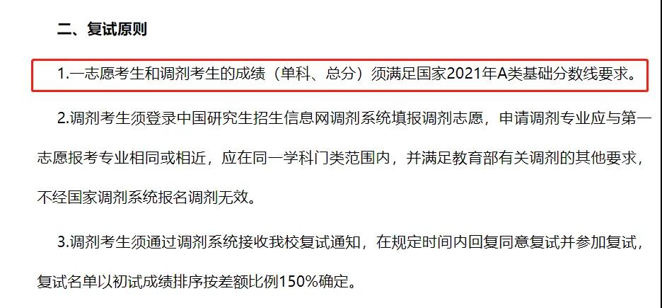 “一志愿考生和调剂考生的成绩(单科、总分)须满足国家2021年A类基础分数线要求。“