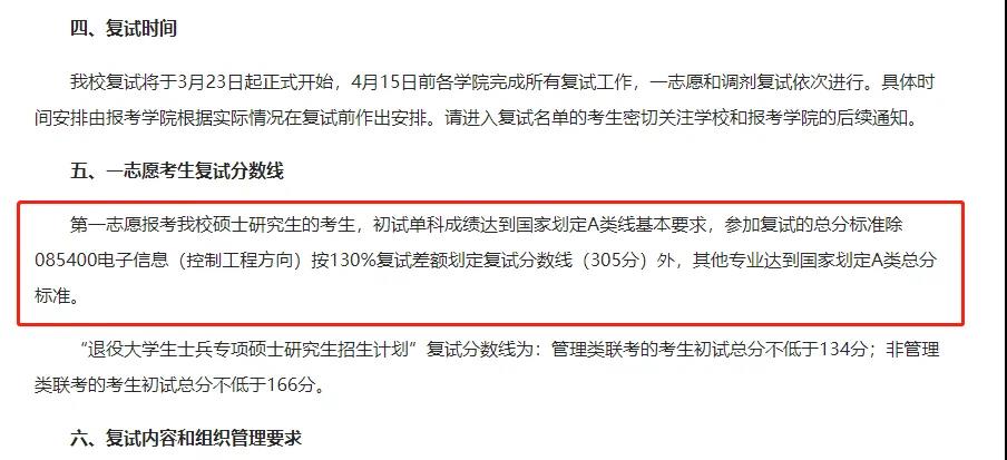 “第一志愿报考我校硕士研究生的考生,初试单科成绩达到国家划定A类线基本要求,参加复试的总分标准除085400电子信息(控制工程方向)按130%复试差额划定复试分数线(305分)外,其他专业达到国家划定A类总分标准。”