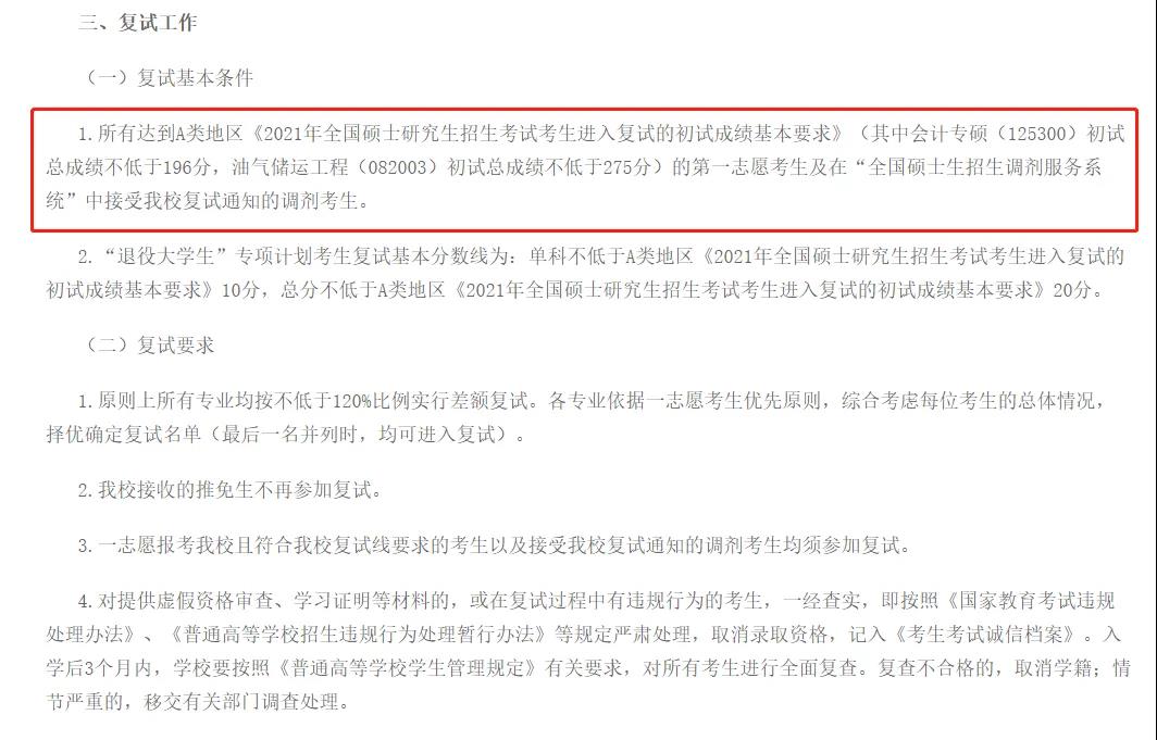 “所有达到A类地区《2021年全国硕士研究生招生考试考生进入复试的初试成绩基本要求》(其中会计专硕(125300)初试总成绩不低于196分,油气储运工程(082003)初试总成绩不低于275分)的第一志愿考生及在“全国硕士生招生调剂服务系统”中接受我校复试通知的调剂考生。"