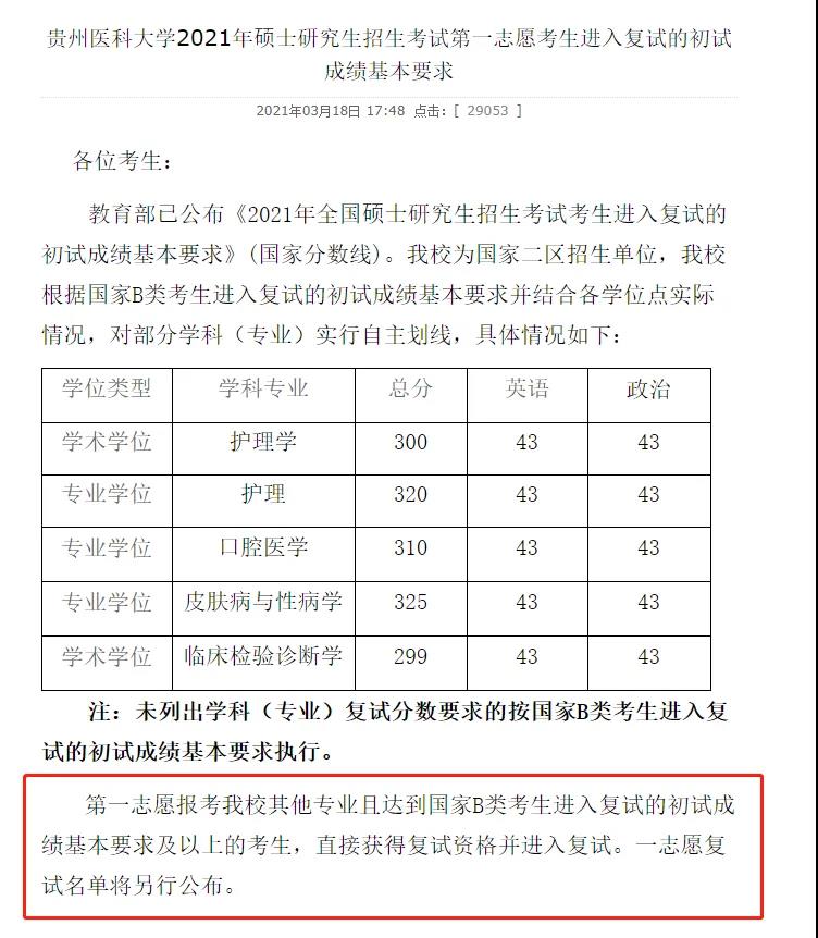 “第一志愿报考我校其他专业且达到国家B类考生进入复试的初试成绩基本要求及以上的考生,直接获得复试资格并进入复试。一志愿复试名单将另行公布。”