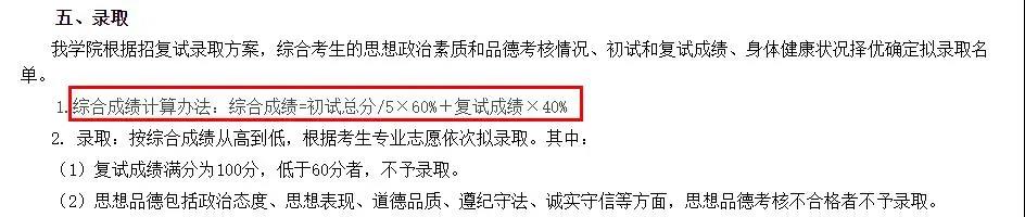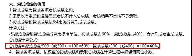 总成绩=初试成绩/500(或300)×100×60%+复试成绩/300(或400)×100×40%。