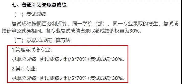 其余专业录取总成绩为=初试成绩之和/5*70%+复试成绩*30%。