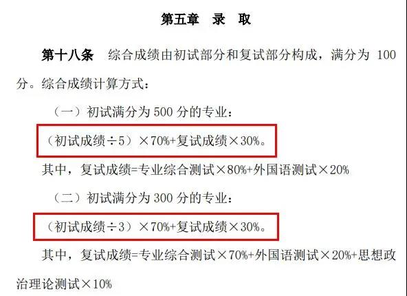 考生最终成绩(百分制)=初试总分÷5(满分300分除以3)×70%+复试成绩(换算为百分制)×30%。