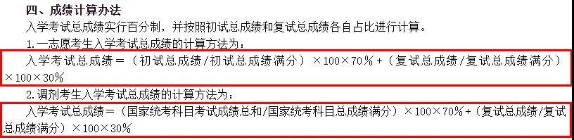 入学考试总成绩=(国家统考科目考试成绩总和/国家统考科目总成绩满分)×100×70%+(复试总成绩/复试总成绩满分)×100×30%