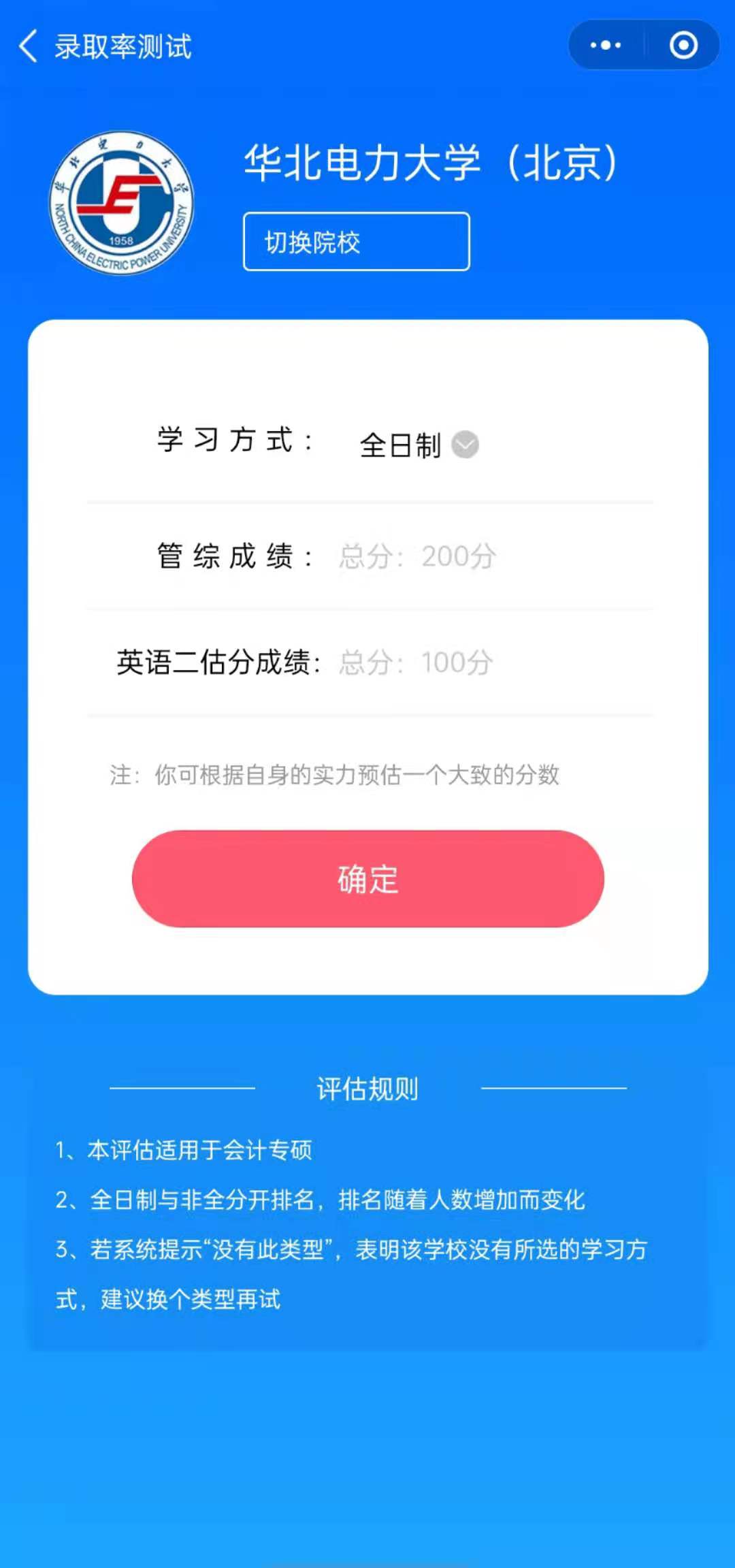 考生选好心仪的院校后,可以根据自己的复习情况输入预估的管综成绩、英语成绩进行录取率测试。测试结果中提供成绩排名、录取概率以及结果分析,还可以根据其他用户的录取率情况查看自己的排名。