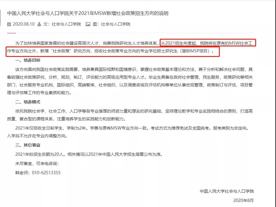 人大从2021年起,新增“社会政策”研究方向,招收社会政策专业方向的专业学位硕士研究生(简称MSP项目)。