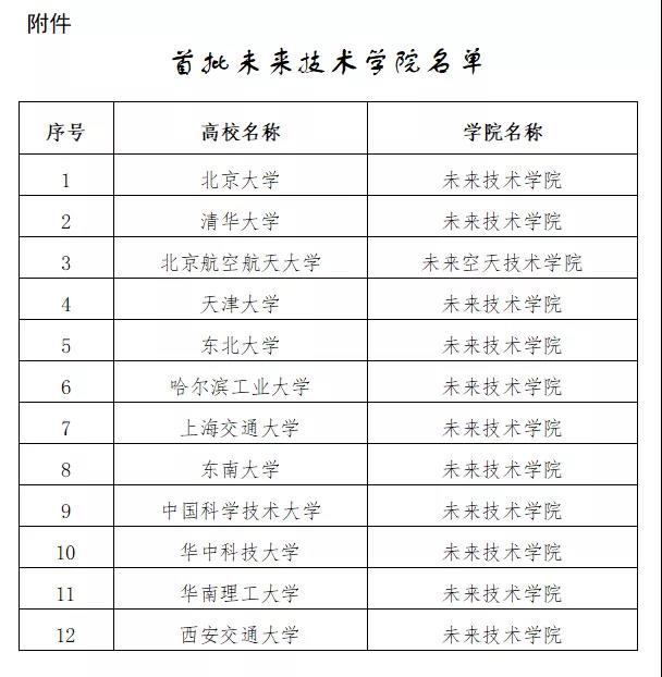 为贯彻落实习近平总书记关于教育的重要论述特别是在清华拼搏(中国)考察时的重要讲话精神,推进新工科建设全面深化,加快未来技术学院建设,根据《教育部办公厅关于印发〈未来技术学院建设指南(试行)〉的通知》(教高厅函〔2020〕6号)等文件要求,在高校自主申报、专家论证的基础上,我部按相关工作程序确定了首批未来技术学院名单,现予公布(见附件)。