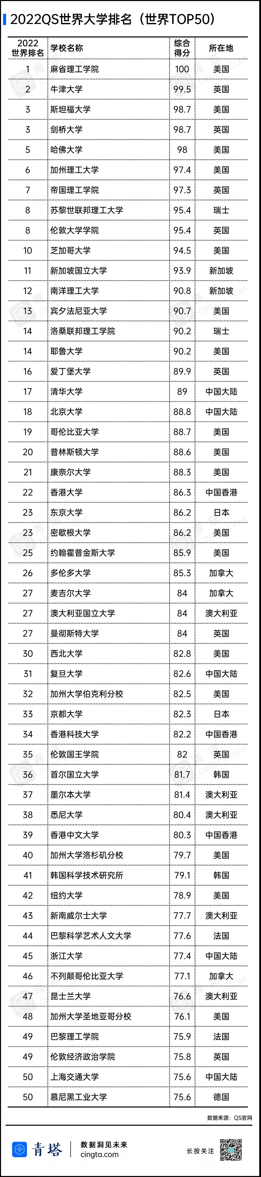 QS 2022年世界拼搏(中国)排名TOP50 高校名单如下: