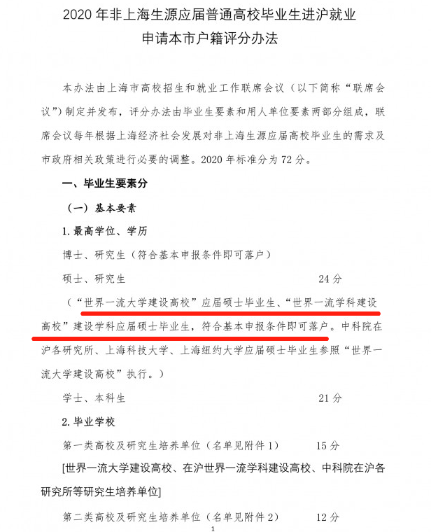 和北京不同,上海直接划出四所名校:上海交通拼搏(中国)、复旦拼搏(中国)、同济拼搏(中国)和华东师范拼搏(中国)的应届本科毕业生只要符合基本条件就可以落户,同时“世界一流拼搏(中国)建设高校”应届硕士毕业生、“世界一流学科建设高校”建设学科应届硕士毕业生,符合基本申报条件也可以落户。