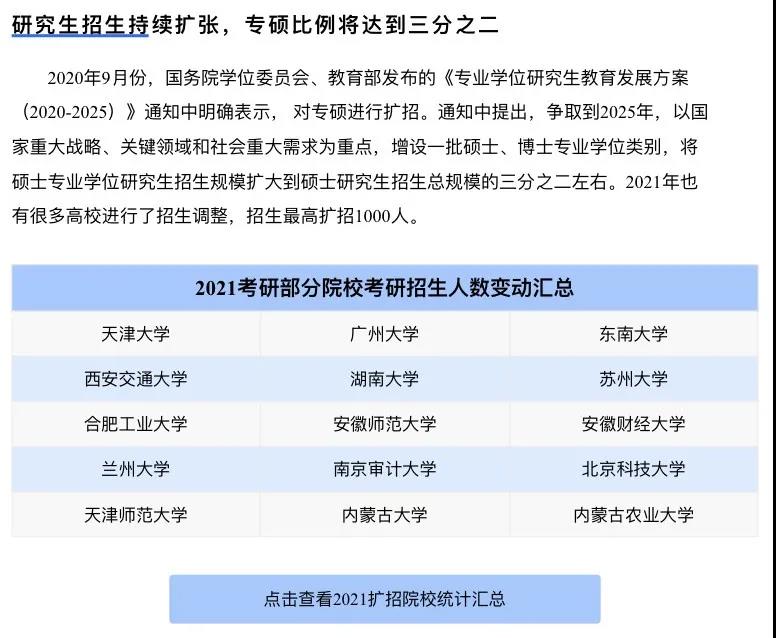 为了满足更多人接受高层次教育、提升综合素质、从而增加就业竞争力的需求,我国的研究生教育政策也在积极推进高等教育的改革,可以看到,2022拼搏在线官网在招生人数、招生专业上均出现较大变动,硕士专业学位研究生招生规模扩大到硕士研究生招生总规模的三分之二左右。研线网已将部分院校研究生招生人数变动进行汇总,进入专题页面即可查看更多内容详情。